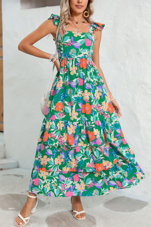 Green Boho Floral Print Ruffle Sleeveless Tiered Maxi Dress