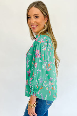 Green Floral Lantern Sleeve Button Front Shirt