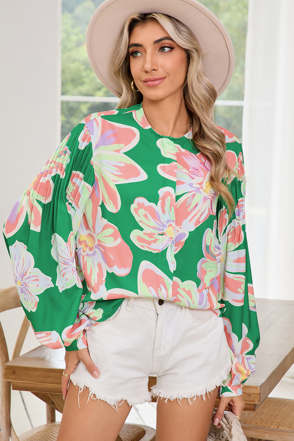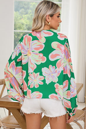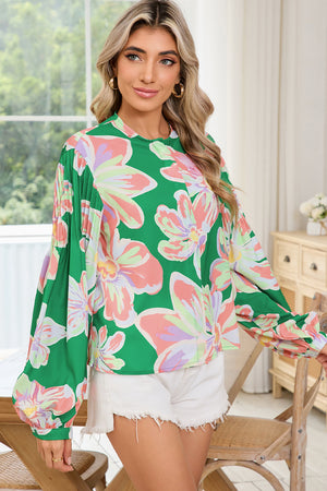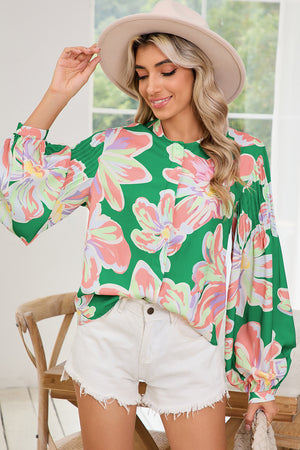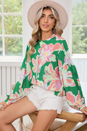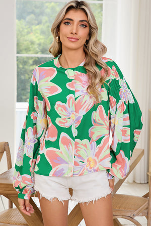 Green Floral Pleated Puff Sleeve Blouse