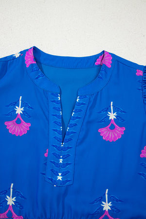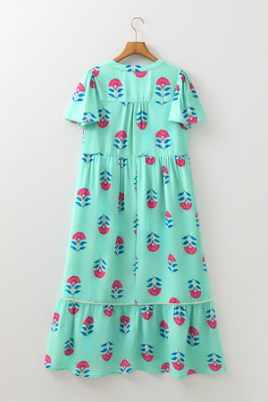 Green Floral Print Notched Neck Flounce Sleeve Midi Dress