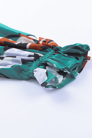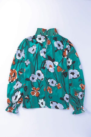 Green Mock Neck Top Floral Print Long Sleeve Silk Blouse