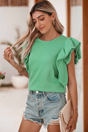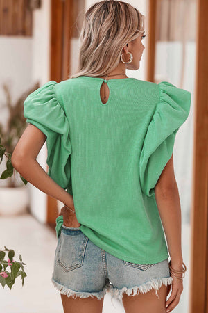 Green Solid Color Ruffle Sleeve Ribbed Blouse