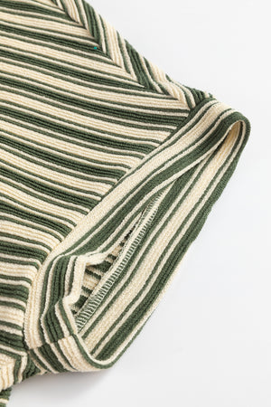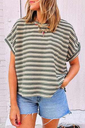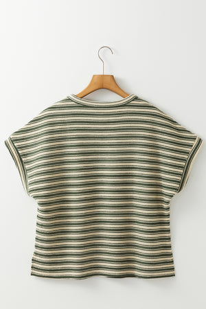 Green Stripe Textured Side Slit Crew Neck T Shirt