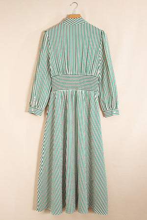Green Striped V Neck Zip Front Cinched High Waist Midi Dress