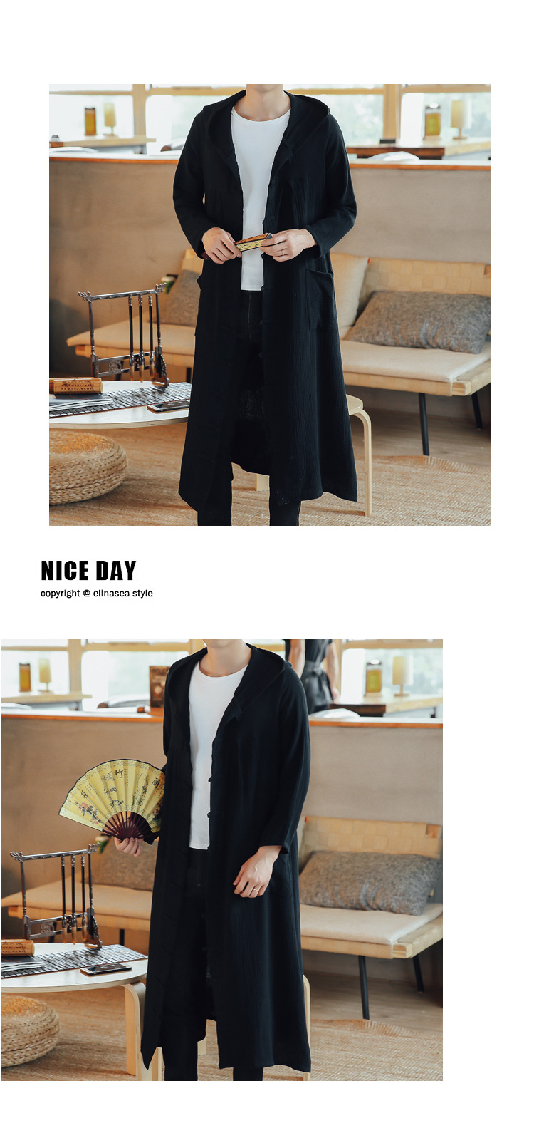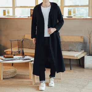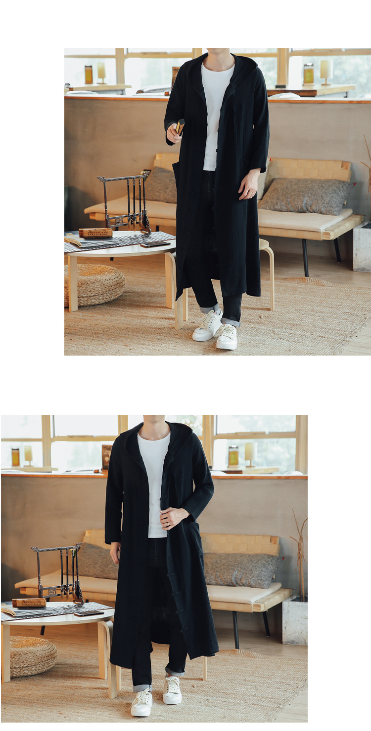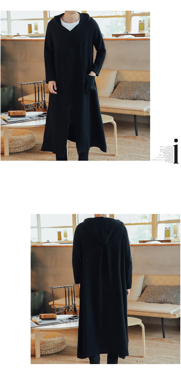 Gefertigt aus einer hochwertigen Baumwoll-Leinen-Mischung, bietet er maximale Atmungsaktivität und ein natürlich angenehmes Tragegefühl. Der lockere, lange Schnitt sorgt für Bewegungsfreiheit, während die Kapuze mit Reverskragen dem Mantel einen markanten, trendigen Touch verleiht.