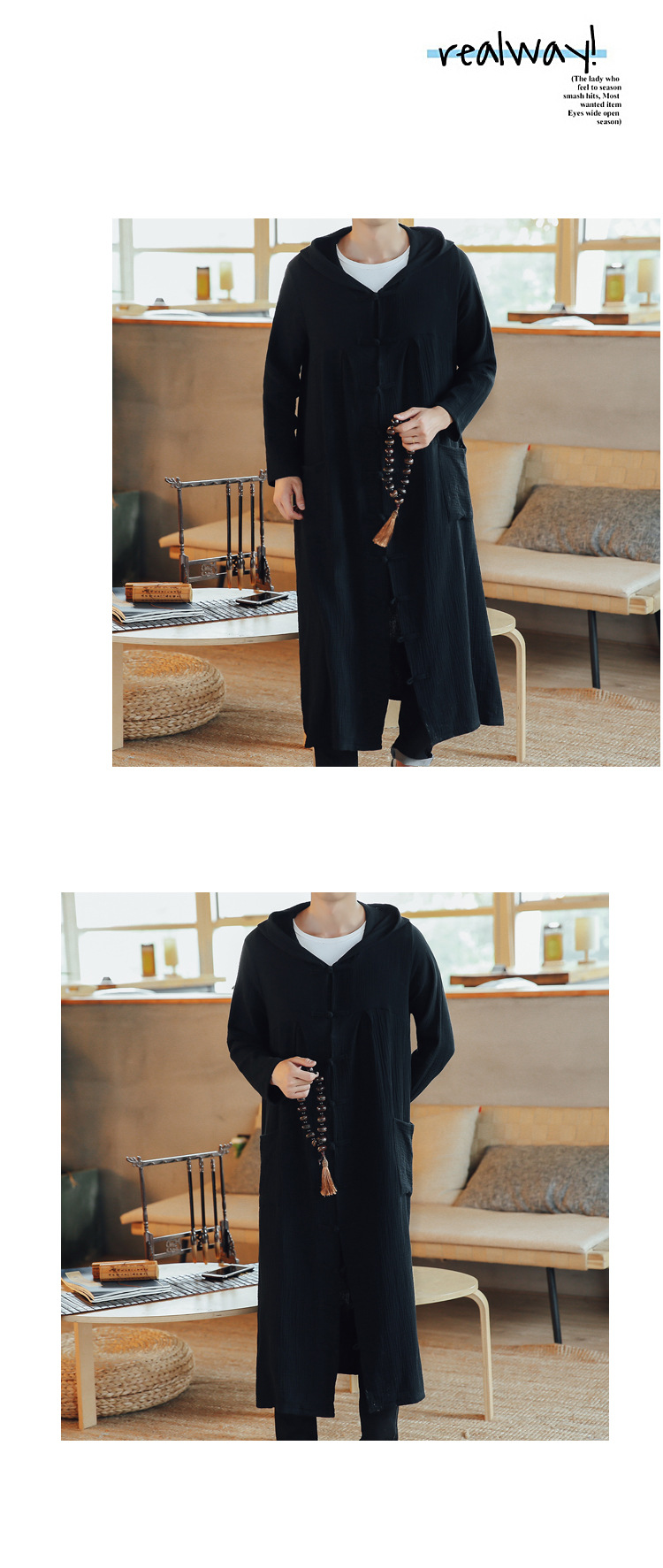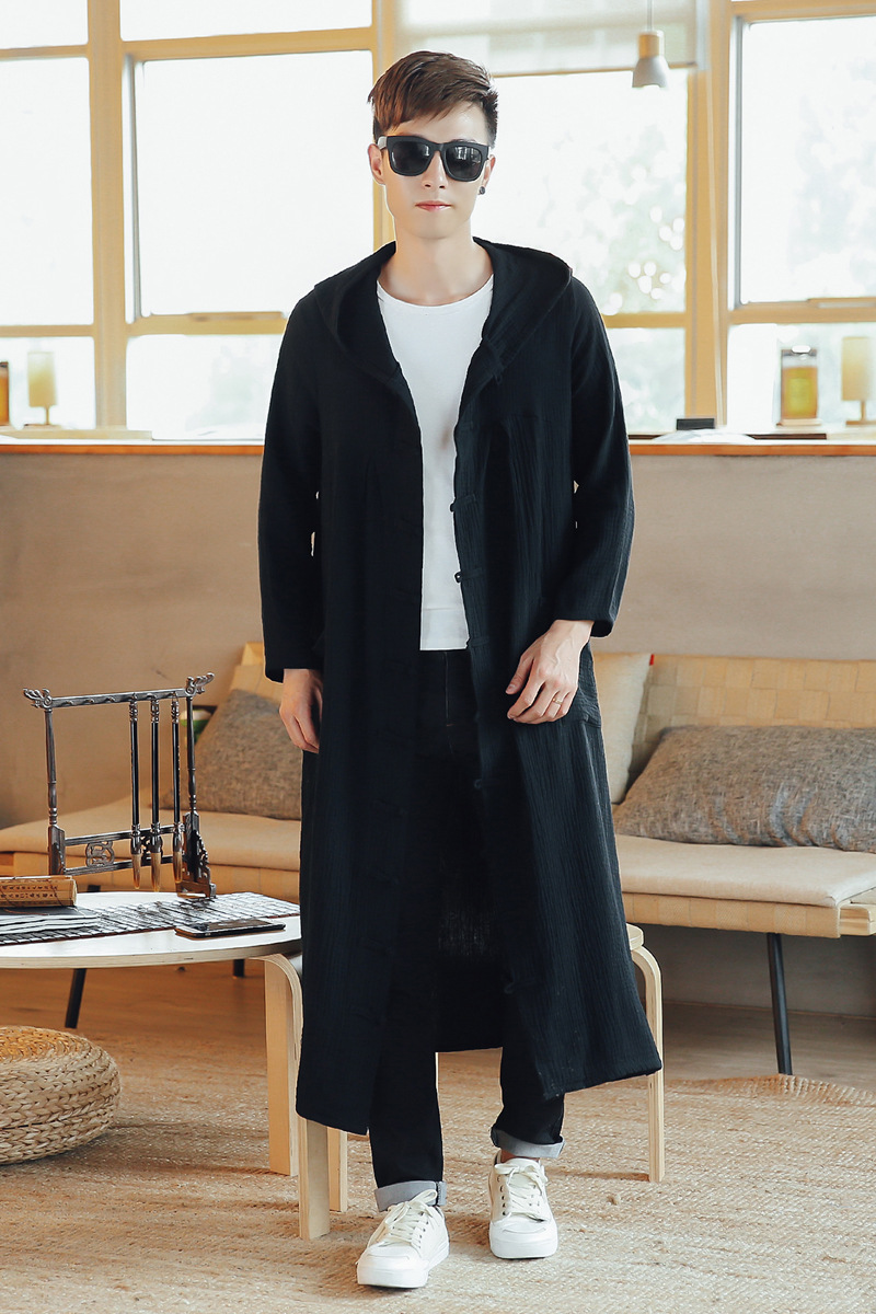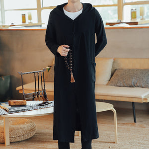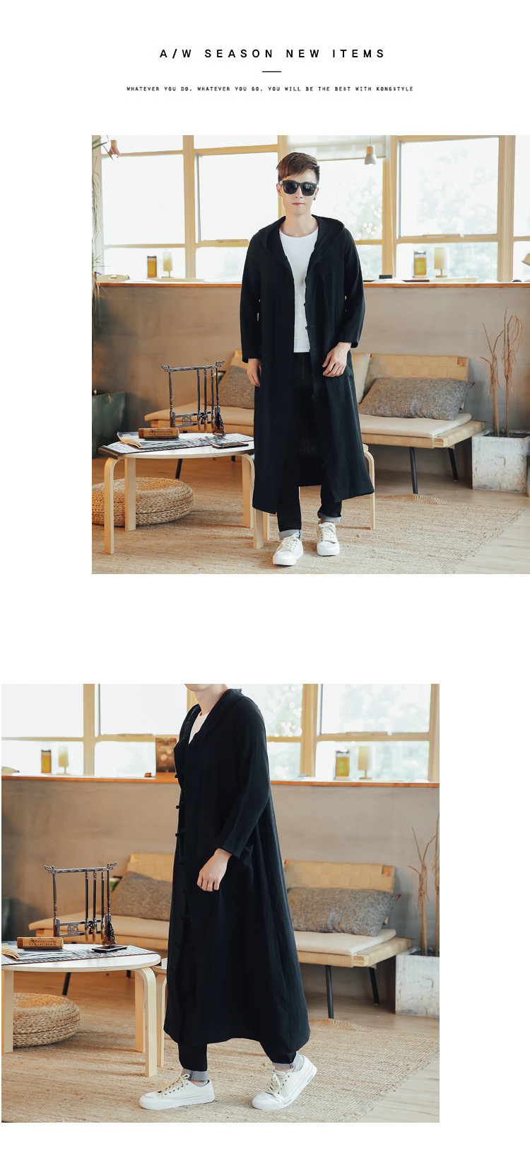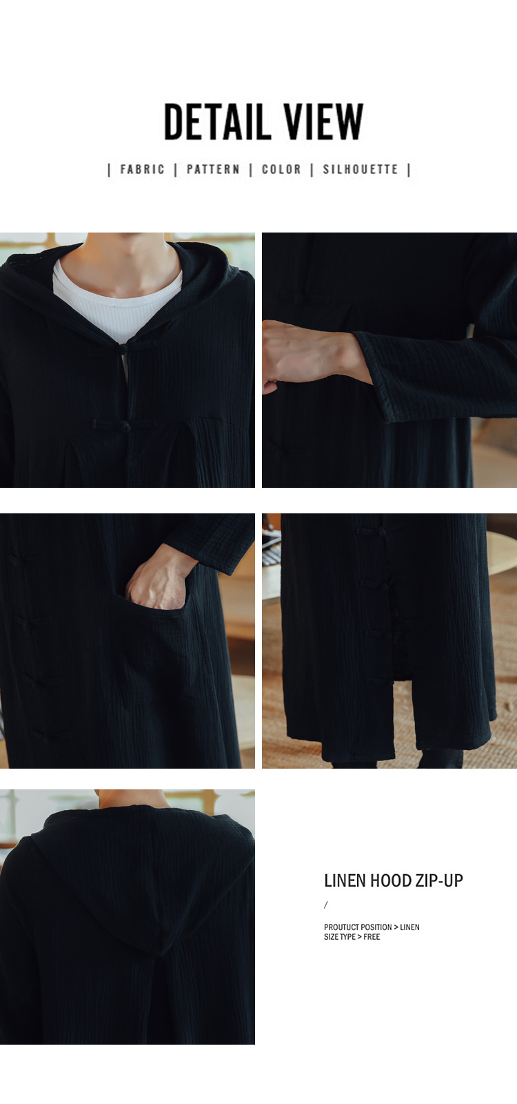 Gefertigt aus einer hochwertigen Baumwoll-Leinen-Mischung, bietet er maximale Atmungsaktivität und ein natürlich angenehmes Tragegefühl. Der lockere, lange Schnitt sorgt für Bewegungsfreiheit, während die Kapuze mit Reverskragen dem Mantel einen markanten, trendigen Touch verleiht.