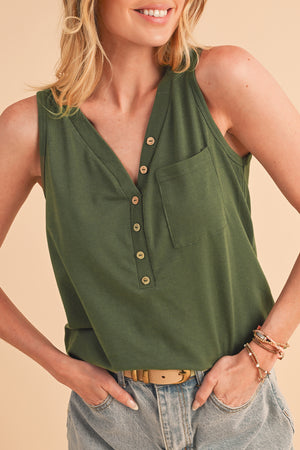 Jungle Green Half Button V Neck Patched Pocket Tank Top