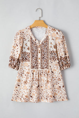 Khaki Boho Floral Print Half Placket Short Sleeve Loose Blouse