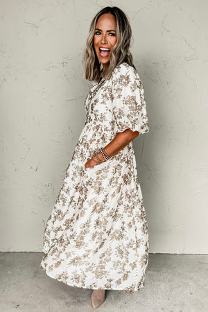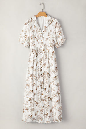 Khaki Floral Puff Sleeve V-Neck Buttoned Front Maxi Dress