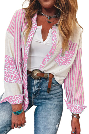 Khaki Leopard Striped Patchwork Button-up Shirt Shacket