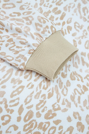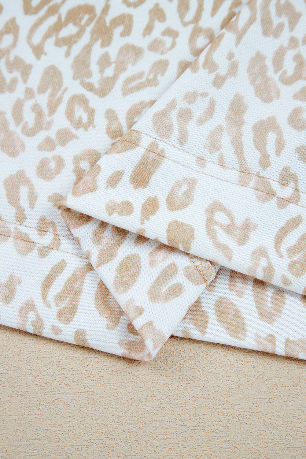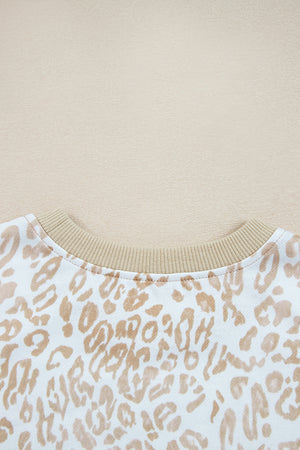 Khaki Ribbed Trim Ruffle Detail Leopard Round Neck Sweatshirt