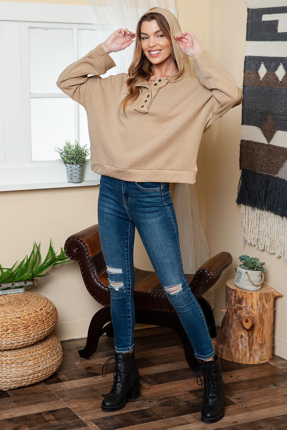 Heim Khaki Solid Color Casual Button Seam Trim Hoodie