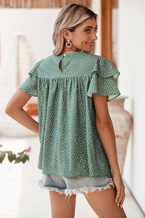 Stilvoll, elegant & vielseitig – Die Laurel Green Spotted Print Pleated Ruffle Sleeve Blouse ist der perfekte Begleiter für modebewusste Frauen, die einen klassischen Look mit einem modernen Twist schätzen. Der verspielte Punktemuster-Print verleiht der Bluse eine zeitlose Eleganz, die sich mühelos für unterschiedliche Anlässe stylen lässt.