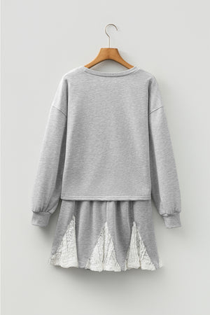 Light Grey Lace Patchwork Drop Shoulder Pullover Drawstring Skort Set