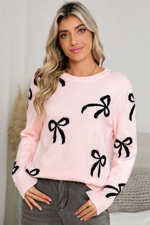 Light Pink Bow Print Long Sleeve Loose Fit Sweater
