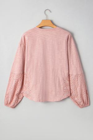 Das Notch V-Neck-Design setzt die feminine Silhouette dezent in Szene, während die weiten Fledermausärmel Komfort und eine Prise Dramatik verleihen. Die detailreiche Lochstickerei im Patchwork-Stil macht jede Bluse zu einem einzigartigen Piece, das mühelos Eleganz mit Individualität verbindet.