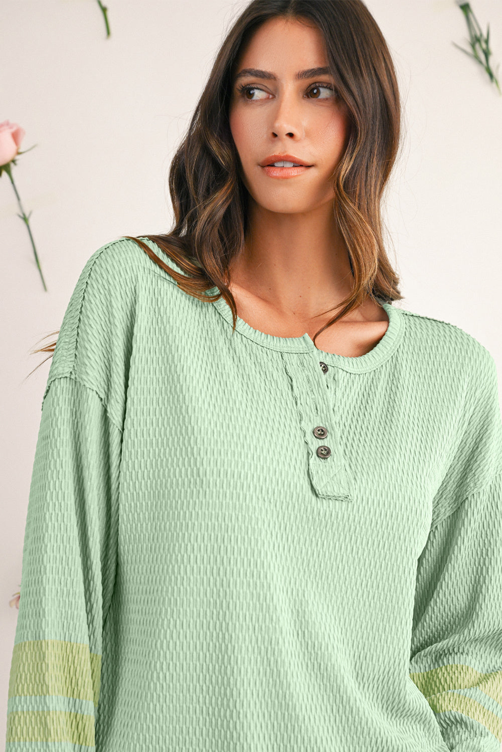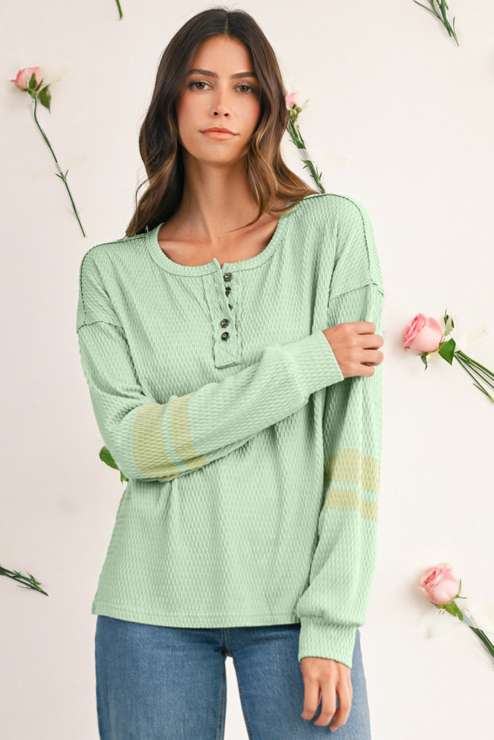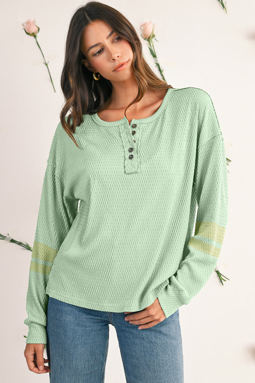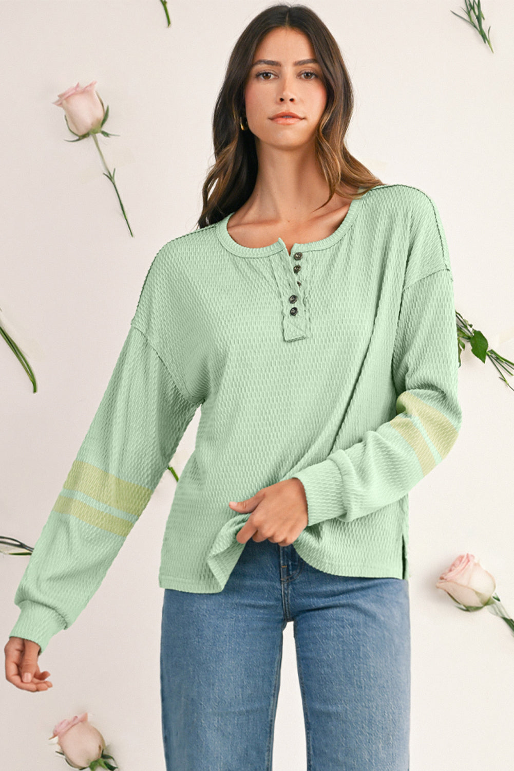 Verleih deinem Casual-Look das gewisse Etwas mit dem Meadow Mist Green Textured Colorblock Sleeve Henley Sweatshirt. Dieses Sweatshirt kombiniert eine einzigartige strukturierte Textur mit trendigen Colorblock-Ärmeln und einem modernen Henley-Ausschnitt. Der Drop-Sleeve-Schnitt sorgt für einen entspannten, lässigen Look, der gleichzeitig bequem und stilvoll ist.