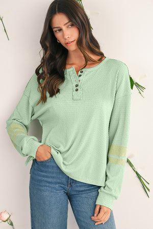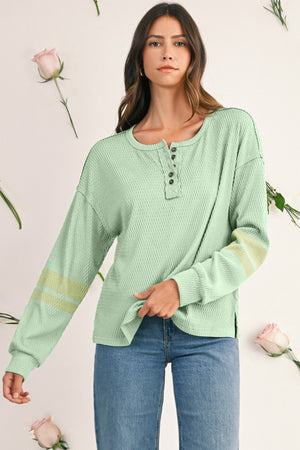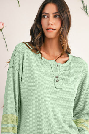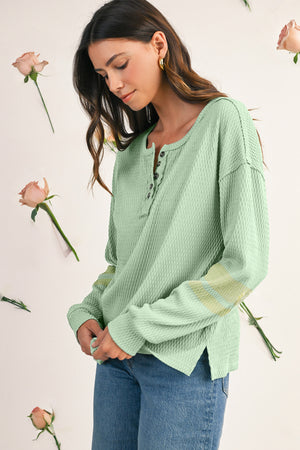 Meadow Mist Green Textured Colorblock Sleeve Henley Sweatshirt