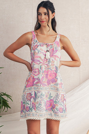 Multicolour Boho Floral Tassel Tie U Neck Mini Dress