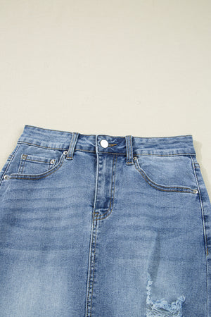 Myosotis Irregular Distressed Hem Denim Midi Skirt