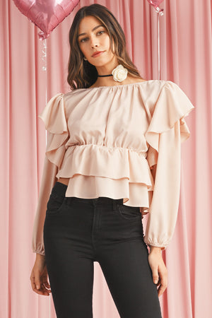 Oatmeal Elegant Satin Ruffle Long Sleeve Blouse