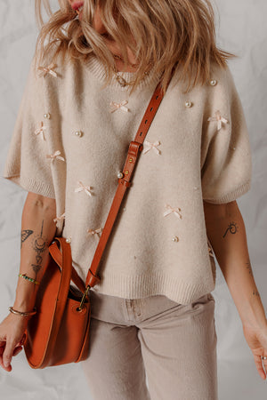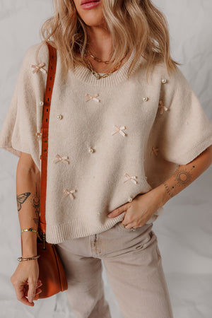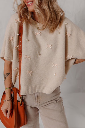 Oatmeal Pearl Bow Embellished Dolman Short Sleeve Sweater