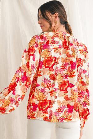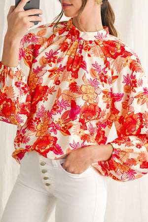 Heim Orange Boho Floral Lantern Sleeve Blouse