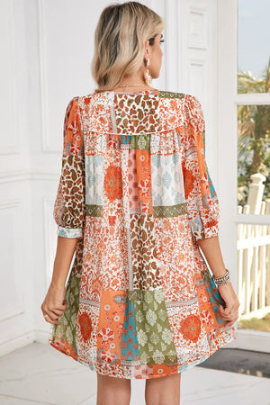 Orange Boho Paisley Mixed Print 3/4 Sleeve Chiffon Loose Dress