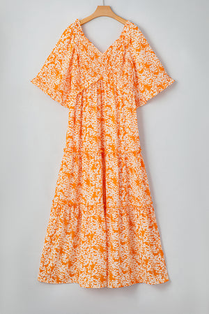 Orange Floral Print Smocked V Neck Bell Sleeve Maxi Dress