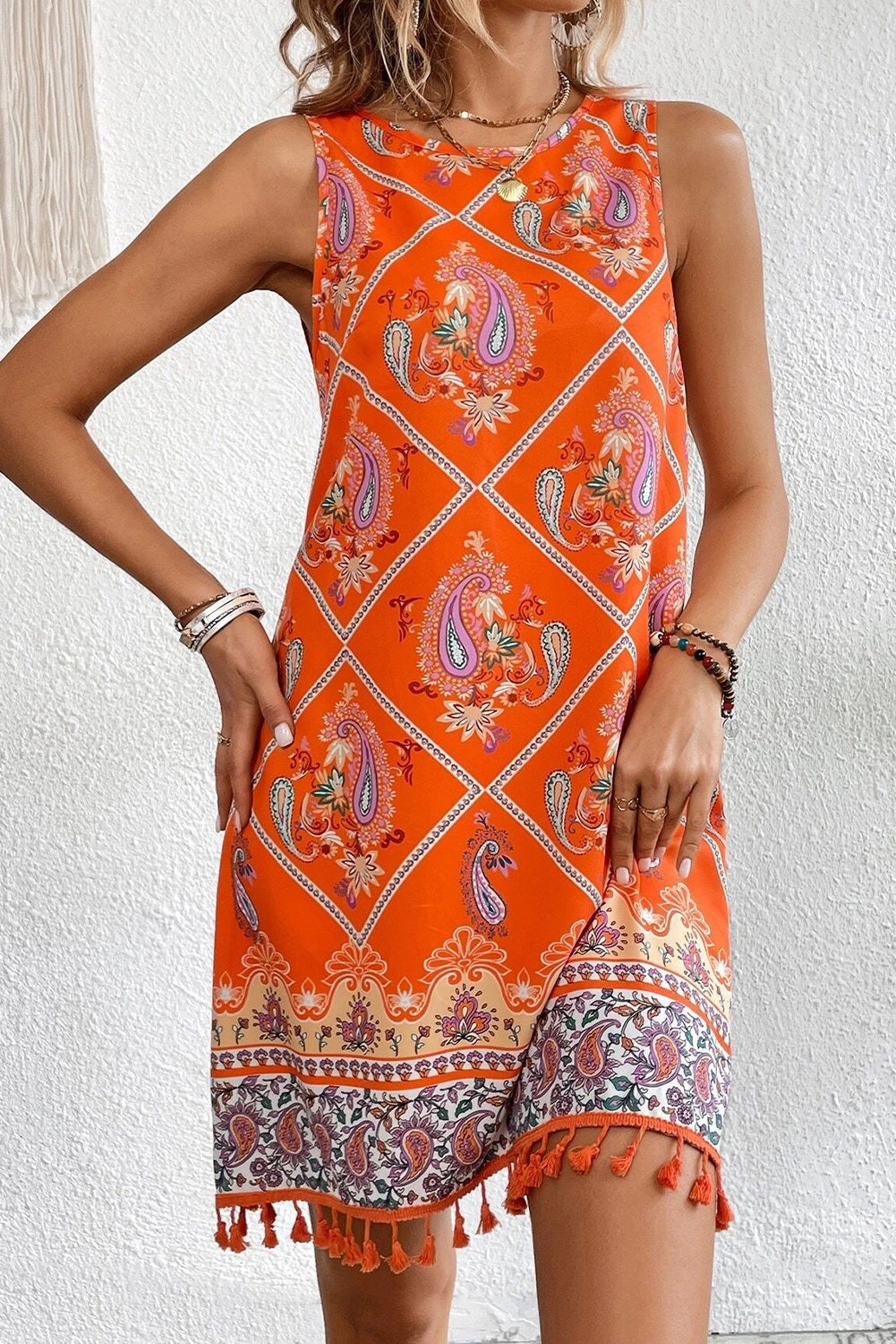 Orange Floral Sleeveless Tassel Trim Shift Mini Dress