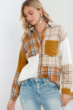 Orange Plaid Color Block Patchwork Pocket Shirt Shacket
