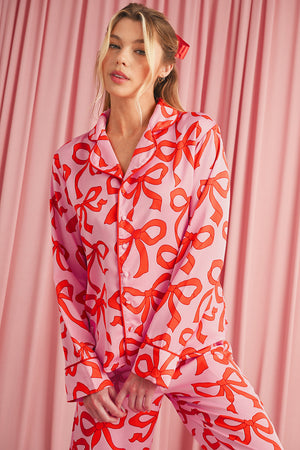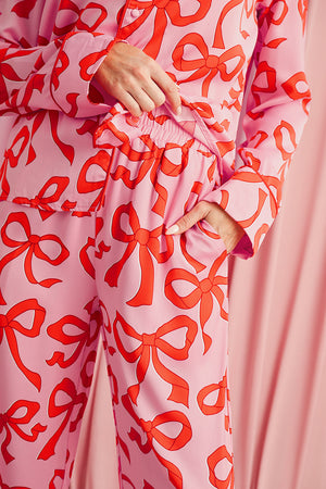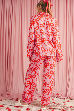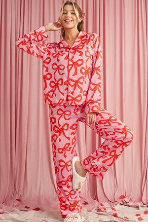 Pink Allover Bow Print Button Up and Loose Pants Pajama Set