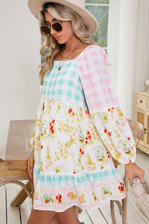 Pink Boho Floral and Plaid Patchwork Ricrac Lantern Sleeve Dress