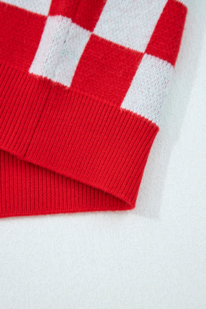 Pink Checkered Christmas Tree Pattern Button V Neck Knit Cardigan