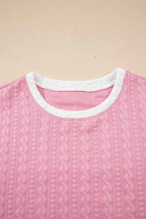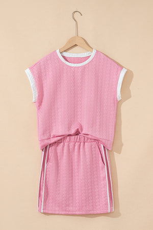 Pink Contrast Trim Textured Crewneck Top and Pocketed Skirt Set