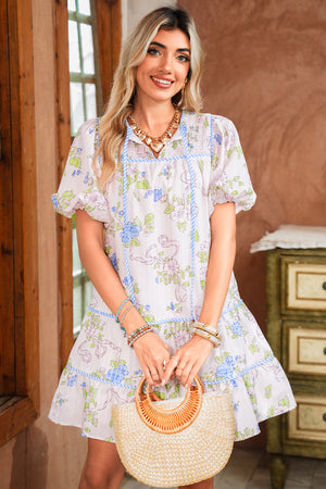 Pink Floral Striped Print Contrast Trim Tie Split Neck Mini Dress