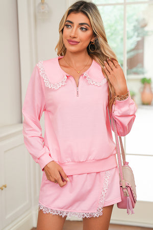 Pink Peter Pan Collar Pullover Lace Embellished Mini Shorts Set