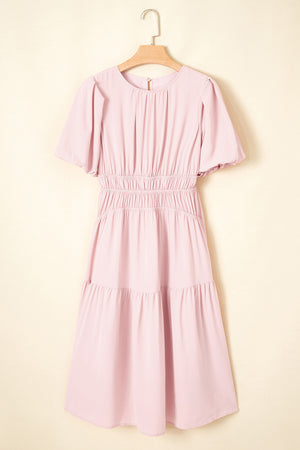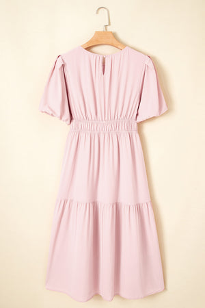Pink Puff Sleeve High Waist Flowy Midi Dress