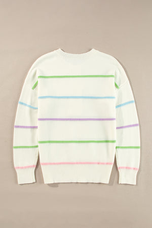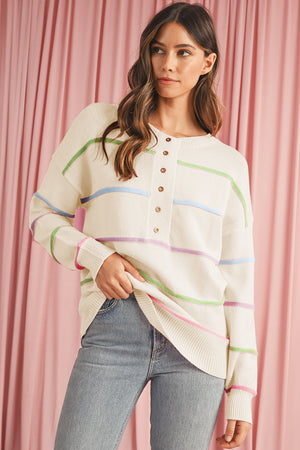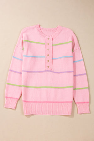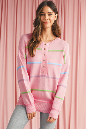 Pink Rainbow Striped Drop Sleeve Henley Sweater