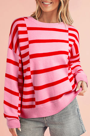 Pink Striped Crewneck Drop Sleeve Knit Sweater