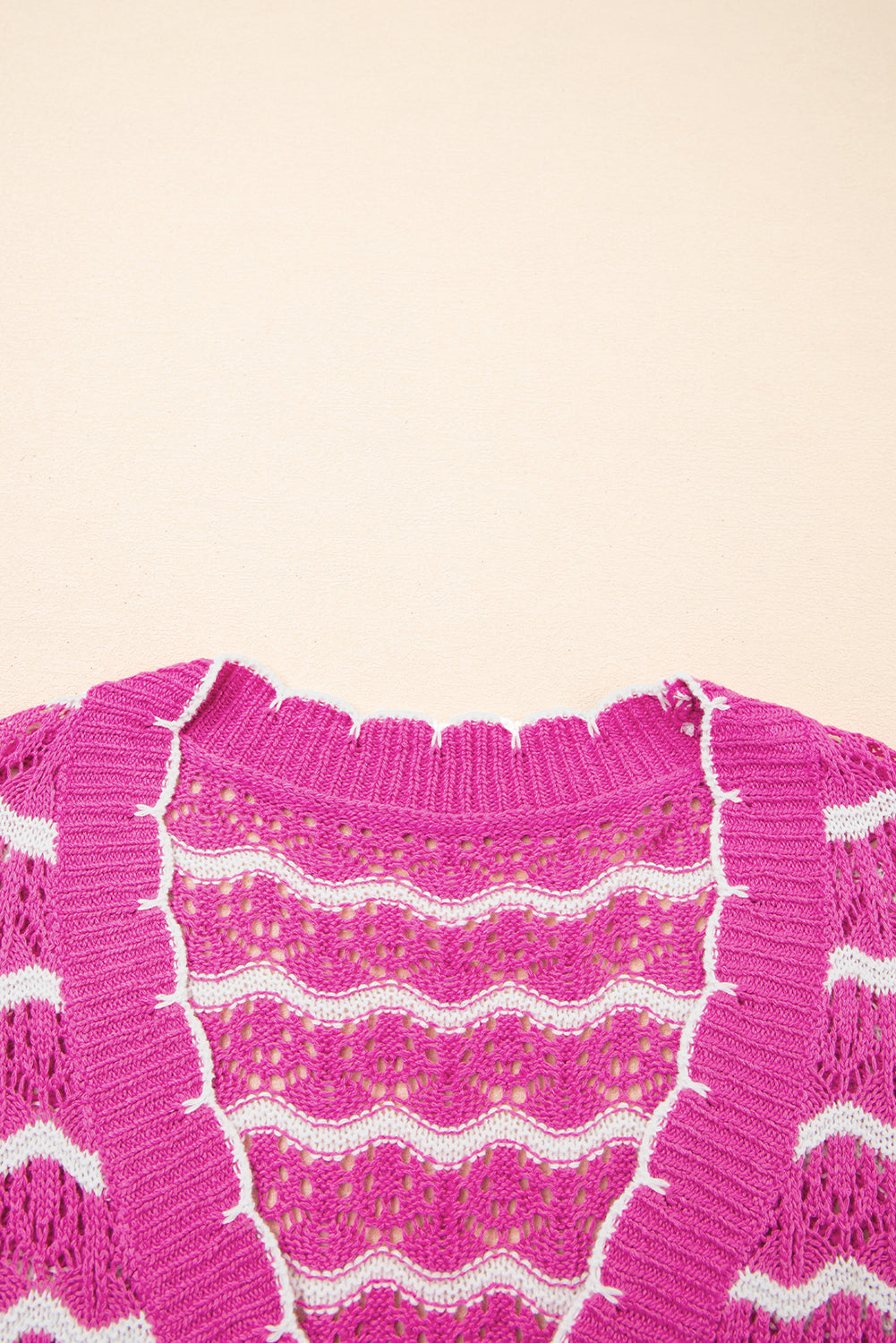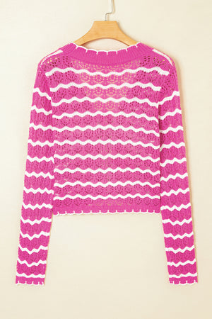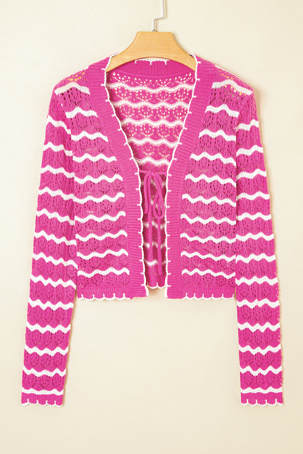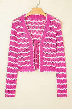 Pink Striped Scalloped Trim Tie Front Cropped Knit Cardigan