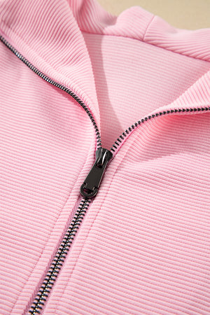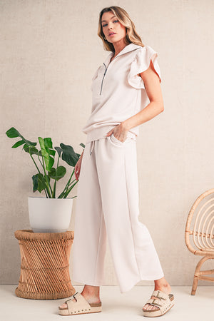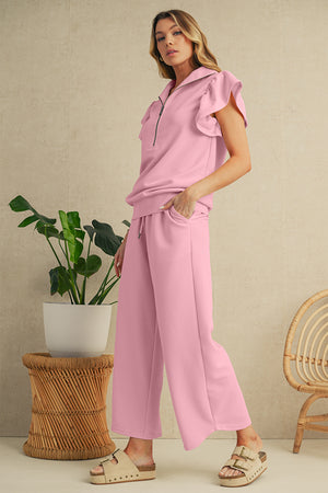 Pink Textured Ruffle Sleeve Zipped Top and Wide Leg Pants Set