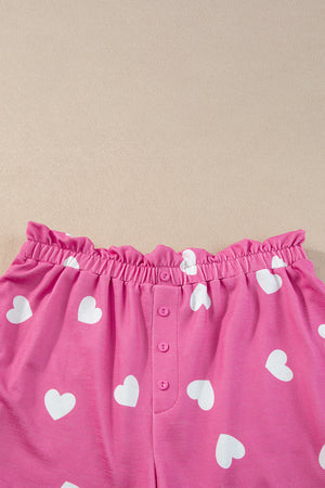 Das Set besteht aus einem langärmligen Oberteil und einer kurzen Schlafhose, beide geschmückt mit einem verspielten Herz-Print in sanften Rosa- und Rottönen.