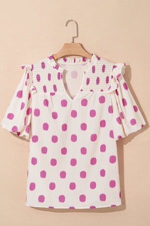 Rose Polka Dot Print Shirred Notched Neck Puff Sleeve Blouse