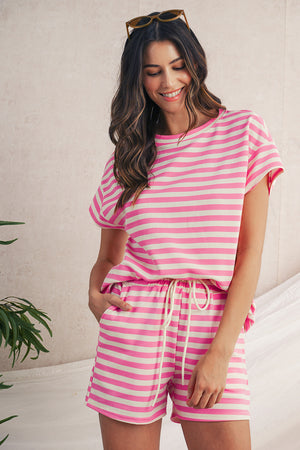 Rose Stripe Crew Neck T Shirt and Drawstring Shorts Set