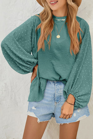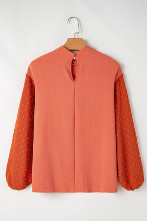 Russet Orange Swiss Dot Balloon Sleeve Patchwork Crinkle Blouse