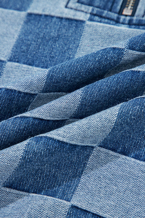 Sky Blue Checkerboard Zipped Collar Kangaroo Pocket Denim Hoodie