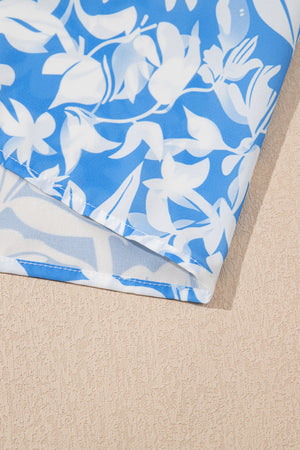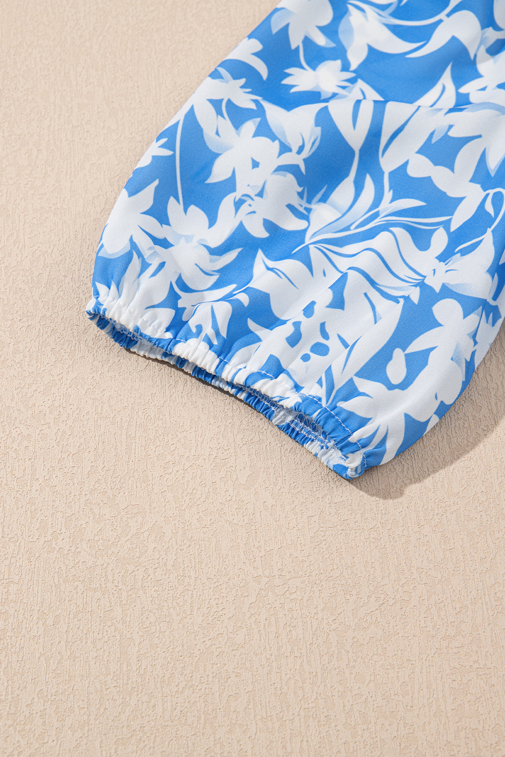 Sky Blue Floral Print Deep V Neck Puff Sleeve Flowy Dress