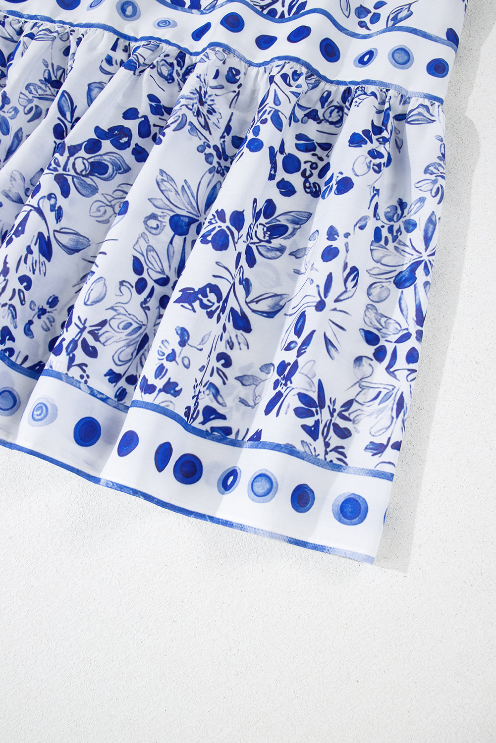 Sky Blue Floral Print Square Neck Bubble Sleeve High Waist Maxi Dress