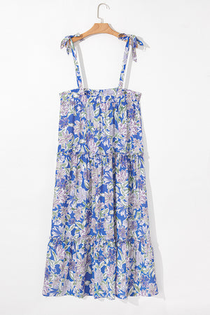 Sky Blue Floral Print Tie Straps Flowy Ruffle Maxi Dress